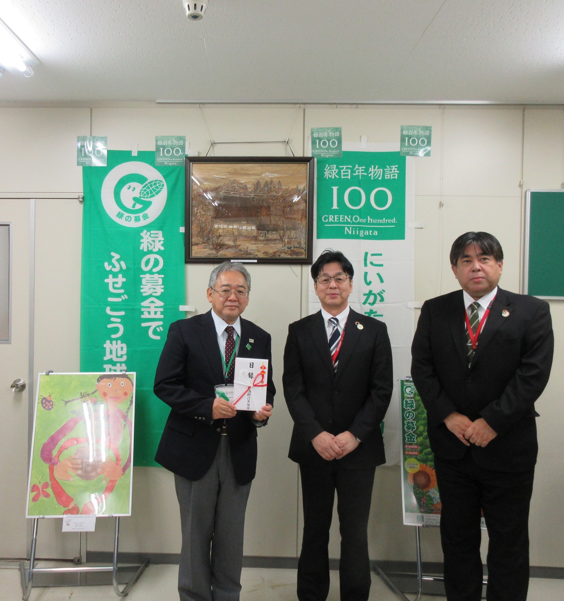 新潟縣信用組合様(〒951-8114 新潟市中央区営所通一番町302番地1、赤川新一理事長)は社会貢献の一環として、当委員会の活動に平成20年から協賛していただいています。本年もこの活動の一環として、9月28日(木)の10万円のご寄付に続き、11月27日(月)に荒木真一理事部長様より30万円のご寄付をいただきました。