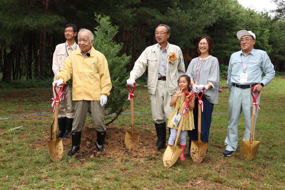 当日は渡辺佐渡市長、事項委員会渡邊会長、地元の児童代表及び平山理事長が佐渡市の木「アテビ」などを植栽、その後参加者全員で雑木林の育樹、木工体験などを行いました。